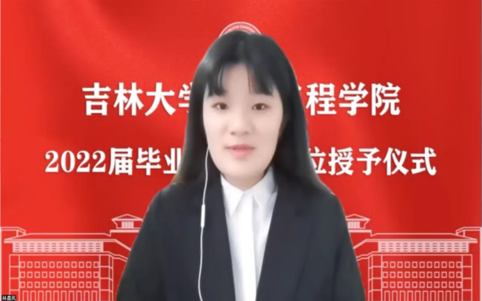 The ceremony commenced with the solemn national anthem. Zheng Dong, Secretary of the CCE CPC Committee, announced the list of students who were awarded the title of “2022 Excellent Graduates of Jilin University”. Chen Wanzhong, Director of the CCE Academic Degree Committee, read out the list of 2022 graduates who obtained doctoral degrees. CCE’s Deputy Dean Yan Xuezhi announced the list of 2022 graduates who obtained master’s degrees, and Deputy Dean Zhao Yan read out the list of 2022 graduates who obtained bachelor’s degrees.