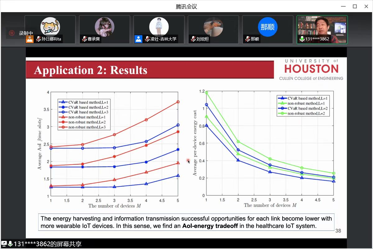 At 9:00 am on August 8th, 2022, the fourth lecture of the lecture series on cutting-edge technologies in information communication and control was successfully held via Tencent platform. Professor Zhu Han of the University of Houston was invited to conduct an online academic exchange entitled “Distributionally Robust Optimization and Machine Learning for Communication Networks” with teachers and students of our College of Communications Engineering. The exchange session was chaired by Professor Fengye Hu.