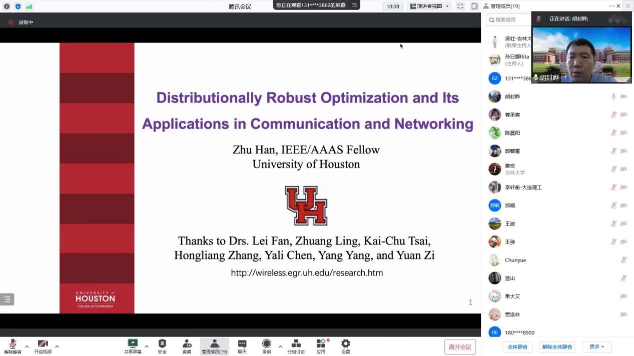 2022年8月8日9:00,第四期信通与控制前沿技术系列讲座通过腾讯平台顺利召开。休斯敦大学Zhu Han教授受邀与beat365师生开展题为“Distributionally Robust Optimization and Machine Learning for Communication Networks”线上学术交流活动。交流会由胡封晔教授主持。