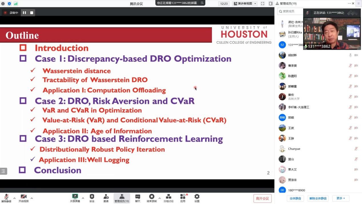 随后,Han教授分享了本次讲座。他基于确定性概率分布和不确定概率分布两种方式入手,延伸介绍了三种常见的优化方式:随机规划鲁棒优化和分布式鲁棒优化。进而介绍了这三种优化方式具有的特征和相互的区别、联系,给出了它们分别适合应用的场景。总结了DRO方式的作用和应用的优势所在。在此基础上,Han老师分享了包括基于差异的 DRO 优化、使用风险规避和CVaR的DRO方法以及基于强化学习的DRO方法在内的三种DRO的案例分析。最后,他阐述了使用DRO方式的动机,并对DRO优化方式、CVaR、以及DRO RL方式的基本内核进行了概况。