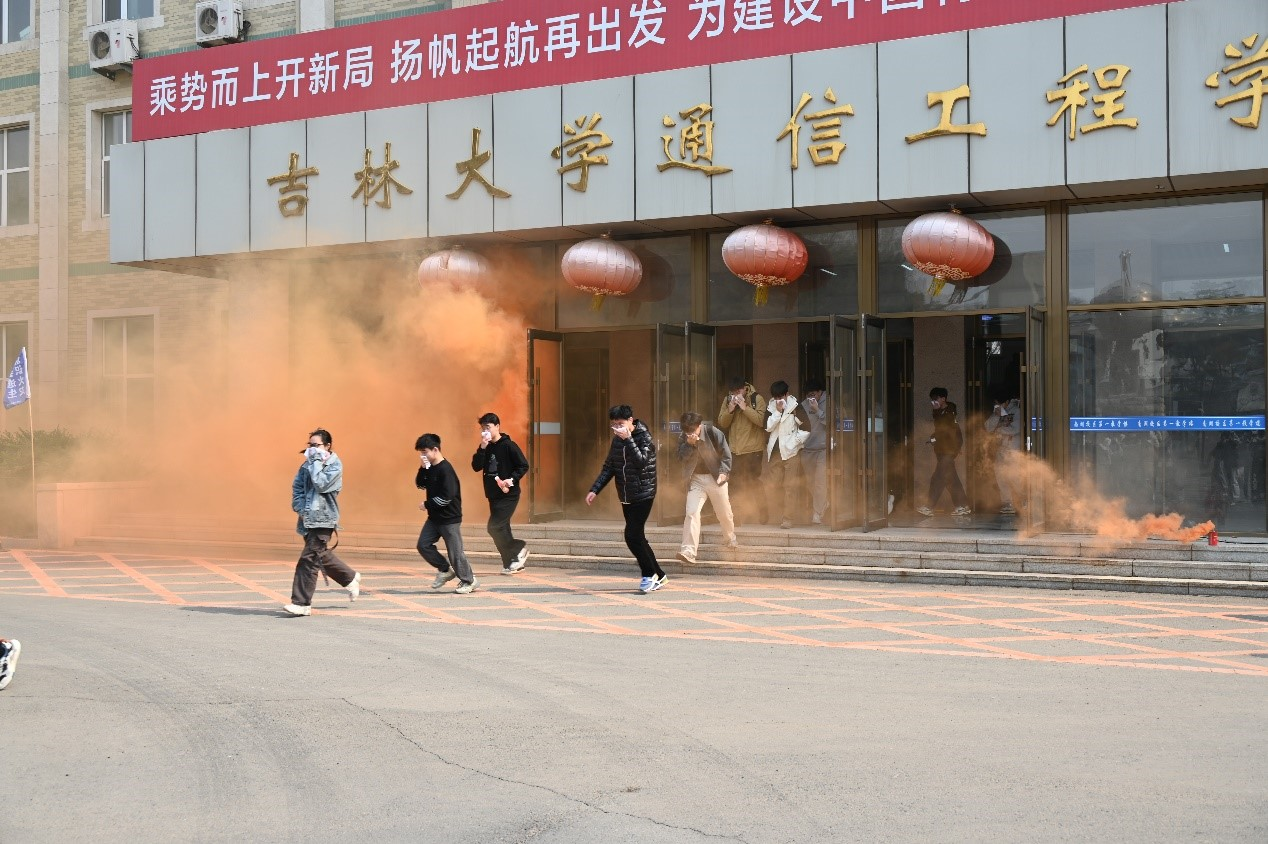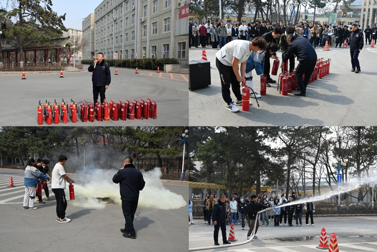 培训结束后,在保卫处工作人员的组织下,与会师生开展了应急疏散演练活动。此次疏散演练活动以第一教学楼内突发火情为背景,警报拉响后,师生反应迅速,在专业人员的指挥下统一向安全出口撤离,用湿毛巾捂住口鼻弯腰穿过浓烟,有序疏散。几分钟后,楼内的师生全部安全疏散到室外。疏散演练达到了预期的目标,取得圆满成功。在第一教学楼门前,陈雷演示了灭火器和消防栓的使用方法,并培训指导部分师生亲手操作,进行灭火演练,让师生在实践中掌握灭火技能。