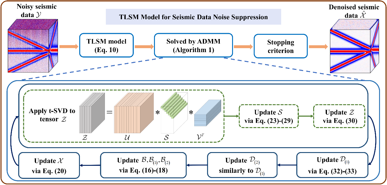 论文简介:针对现有稀疏张量恢复方法在实际地震数据非平稳性及噪声影响下难以准确估计张量系数方差的问题,提出了一种三重拉普拉斯尺度混合(TLSM)模型,如图1所示。该方法通过引入拉普拉斯尺度混合分布,联合估计稀疏张量系数及潜在尺度参数,从而提升噪声抑制效果。大量合成及真实数据实验表明,TLSM方法在定量指标与视觉效果上均优于现有地震数据去噪算法,并具备更高的计算效率。