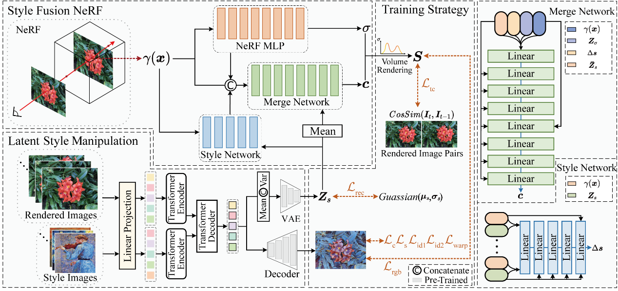 论文概述:近期研究表明,神经辐射场(NeRFs)在三维风格迁移领域展现出巨大潜力。然而,现有基于NeRF的风格迁移方法在生成风格化图像时,仍面临如何同时保持清晰场景纹理与强跨视角一致性的重大挑战。为突破这些局限,本文提出一种创新的Transformer引导式三维场景风格迁移方法。具体而言,我们首先设计基于Transformer的风格迁移网络,通过捕获长程依赖关系生成具有初始一致性的二维风格化图像,为三维风格化生成提供监督信号。为实现对风格的细粒度控制,我们引入潜在风格向量作为条件特征,并设计将风格信息投影至三维空间的风格网络。进一步开发合并网络,将风格特征与场景几何结构相结合,渲染出视觉连贯且风格统一的二维风格化图像。此外,我们提出了纹理一致性损失函数,以保持场景结构并增强跨视角的纹理保真度。大量定性与定量实验结果表明,本文所提方法在视觉感知、图像质量和多视角一致性方面均优于当前主流先进方法。